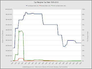 As you can see from this chart, the top marginal rate rose substantially once FDR took office, but the bottom of the top bracket also rose to a very high amount in constant 2005 dollars. The cutoff for the bracket was then reduce dramatically once World War II spending ramped up in 1942.