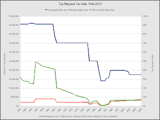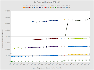 This is yet another of my confusing charts. I tried to show both marginal rates and cutoffs for all brackets, but the rates are hard to see. Note that the dollar amounts are for married couples filing jointly. 2010 isn't included because the CPI factor isn't available yet.