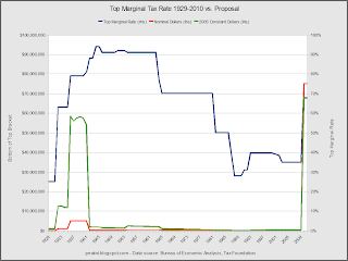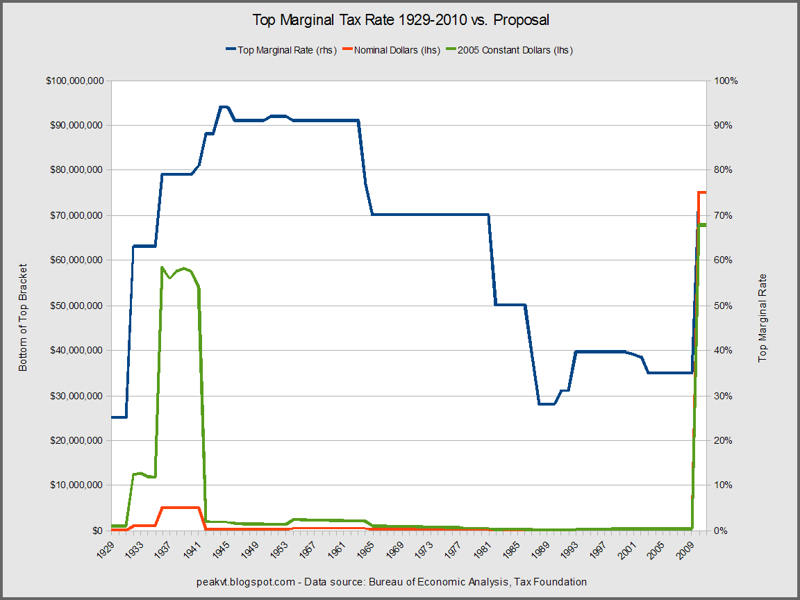 I chose to set the brackets at 1, 3, 5, 10, 20, 100, 1000, and 5000 times the minimum wage. To the left is a copy of the first chart with my proposal tacked onto the end. Both the top rate and bracket would go back to levels similar to those in the 1930s.